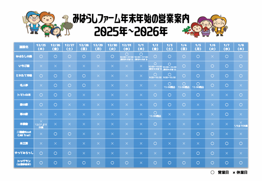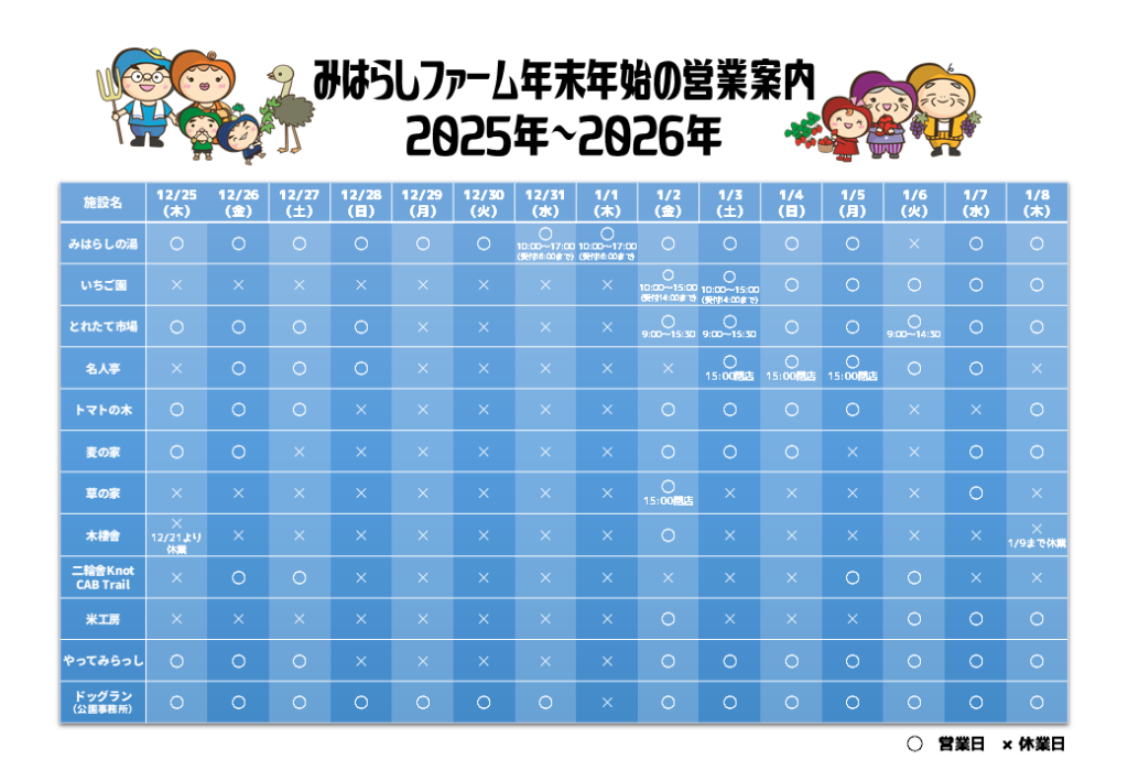 みはらしファームにお出かけの際には下の一覧を参考にしていただきますようお願いいたします!