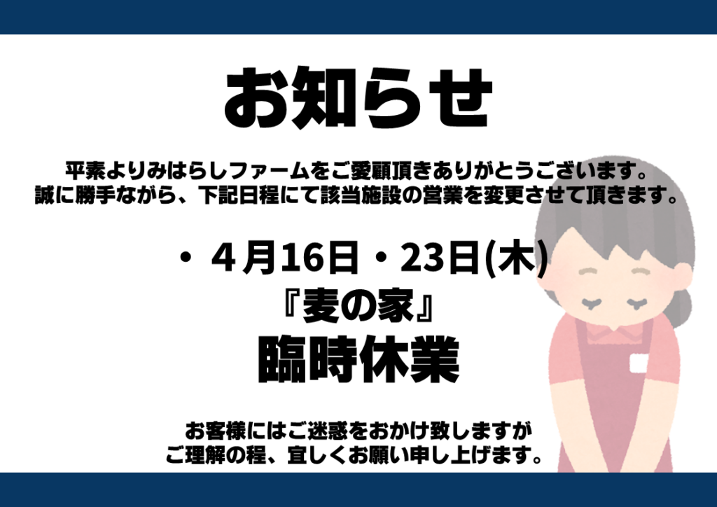 臨時休業のお知らせ: 4月16日・23日『麦の家』