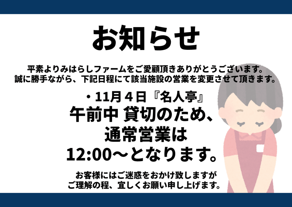 臨時休業のお知らせ:11月4日午前 そば処『名人亭』