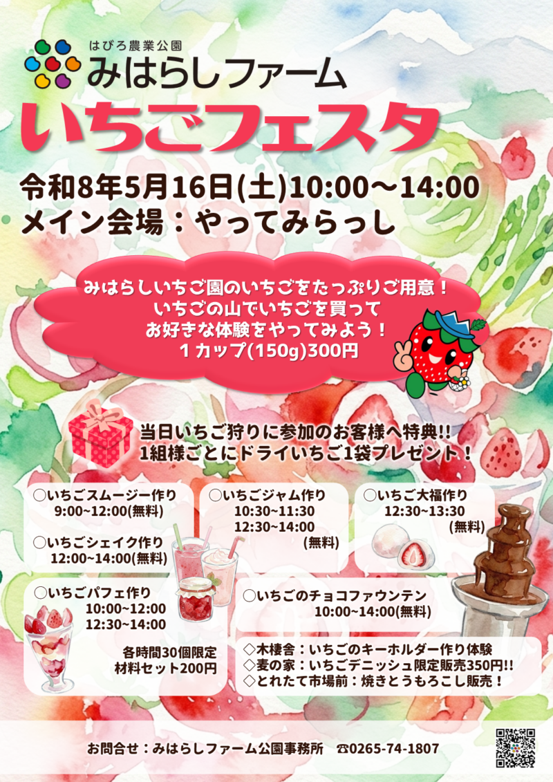 みはらしファームでは、5月16日(土)に「いちごフェスタ」を開催いたします! 「いちごスムージー」や「いちご大福」などの手作り体験(無料)や、限定30個の「いちごパフェ作り」、さらに当日いちご狩りをご利用の方への限定特典など、いちご尽くしの特別な1日です。