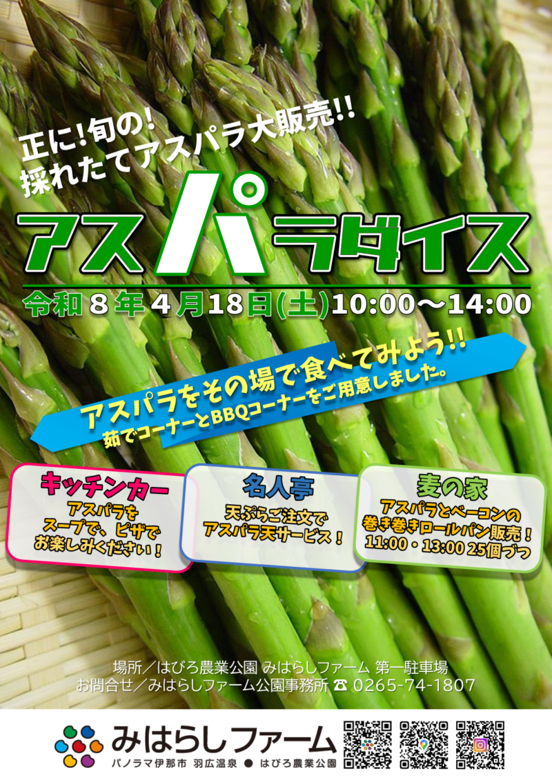 長野県内1位の生産量を誇るJA上伊那の採れたてアスパラを、その場で「買って・焼いて・食べる」ことができる、みはらしファームならではの体験型イベントです。