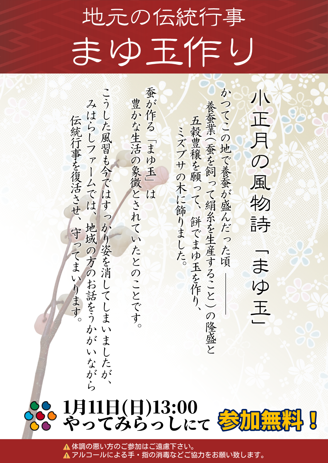 地域の伝統を次世代へ。新春の彩り「まゆ玉作り」 みはらしファームでは、1月11日(日)にお正月の伝統行事「まゆ玉作り」を行います。 かつて養蚕(ようさん)が盛んだった伊那地方の文化に触れながら、一年の豊作と幸せを願う飾り作りを体験してみませんか? 【開催概要】 日時:1月11日(日) 午後1時(13:00)〜 会場:体験交流の家「やってみらっし」 参加費:無料 内容:米粉を使ったまゆ玉作りと飾り付け体験 【伝統行事「まゆ玉作り」について】 その昔、伊那の地で絹糸を生産する養蚕が非常に盛んだった頃、小正月には養蚕の隆盛や五穀豊穣を願う習慣がありました。お餅で「まゆ」を模した「まゆ玉」を作り、実りの象徴としてミズキの枝に飾るこの風習は、今では見かけることが少なくなった貴重な文化です。 みはらしファームでは、地域の皆様からお話を伺いながら、この大切な伝統行事を復活させ、守り続けています。 【イベントのポイント】 当日は米粉を使って、色鮮やかなまゆ玉を作ります。 出来上がった「まゆ玉飾り」はお持ち帰りいただけますので、ぜひご自宅に飾って新春の縁起物としてお楽しみください。